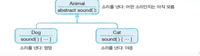들어서 모든 동물은 소리를 내기 때문에 sound(); 라는 메소드를 추상 클래스에 정의를 하고 각각 동물의
