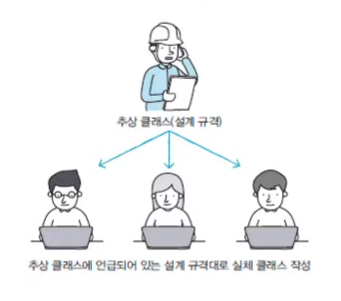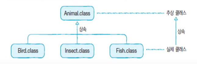 추상 클래스가 부모, 실체 클래스가 자식으로 구현되어 실체 클래스는 충상 클래스의 모든 특성을 물려받고,